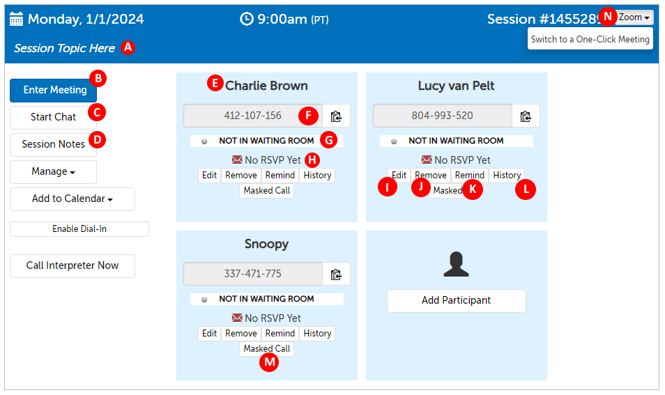 • K. Remind: manually send reminder to participant. (Reminders are automatically sent about 2 hours before and 10 minutes before session start time, unless reminders are disabled in Account Settings.)